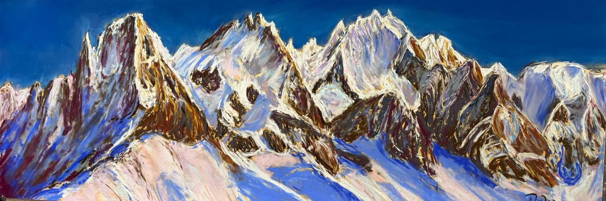 This original landscape feature of the Aguille des Chamonix from Plan Praz depicts the dramatic scenery that surrounds one of the most beloved Alpine destinations, and is available to purchase via the Ski Club Shop for Ski Club Members and lovers of stunning mountain scenery alike. This piece is available as an original (pastels on paper) only, and measures 100cm by 35cm. Postage is included in the sale price - please select "Artwork Printing & Posting" when choosing post options