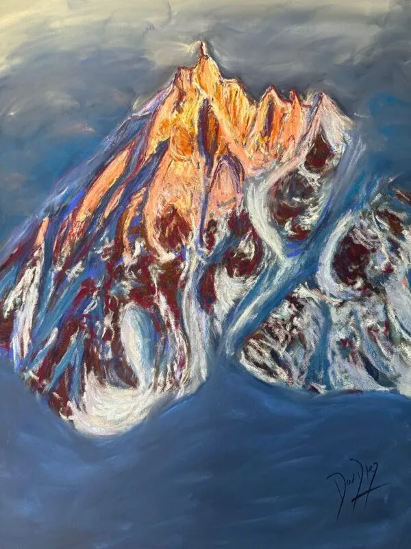 This stunning view of the Aguille du Midi, Chamonix, at dusk is available to purchase via the Ski Club Shop for Ski Club Members and lovers of stunning mountain scenery alike. This piece is available either as an original (pastels on paper) or as an A1 or A2-sized print. Postage is included in the sale price - please select "Artwork Printing & Posting" when choosing post options